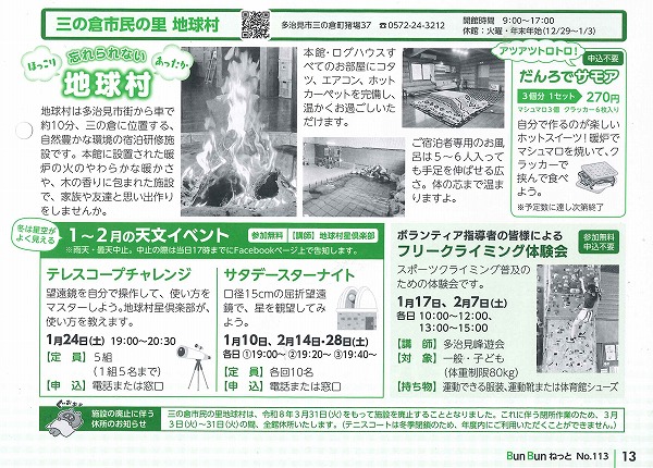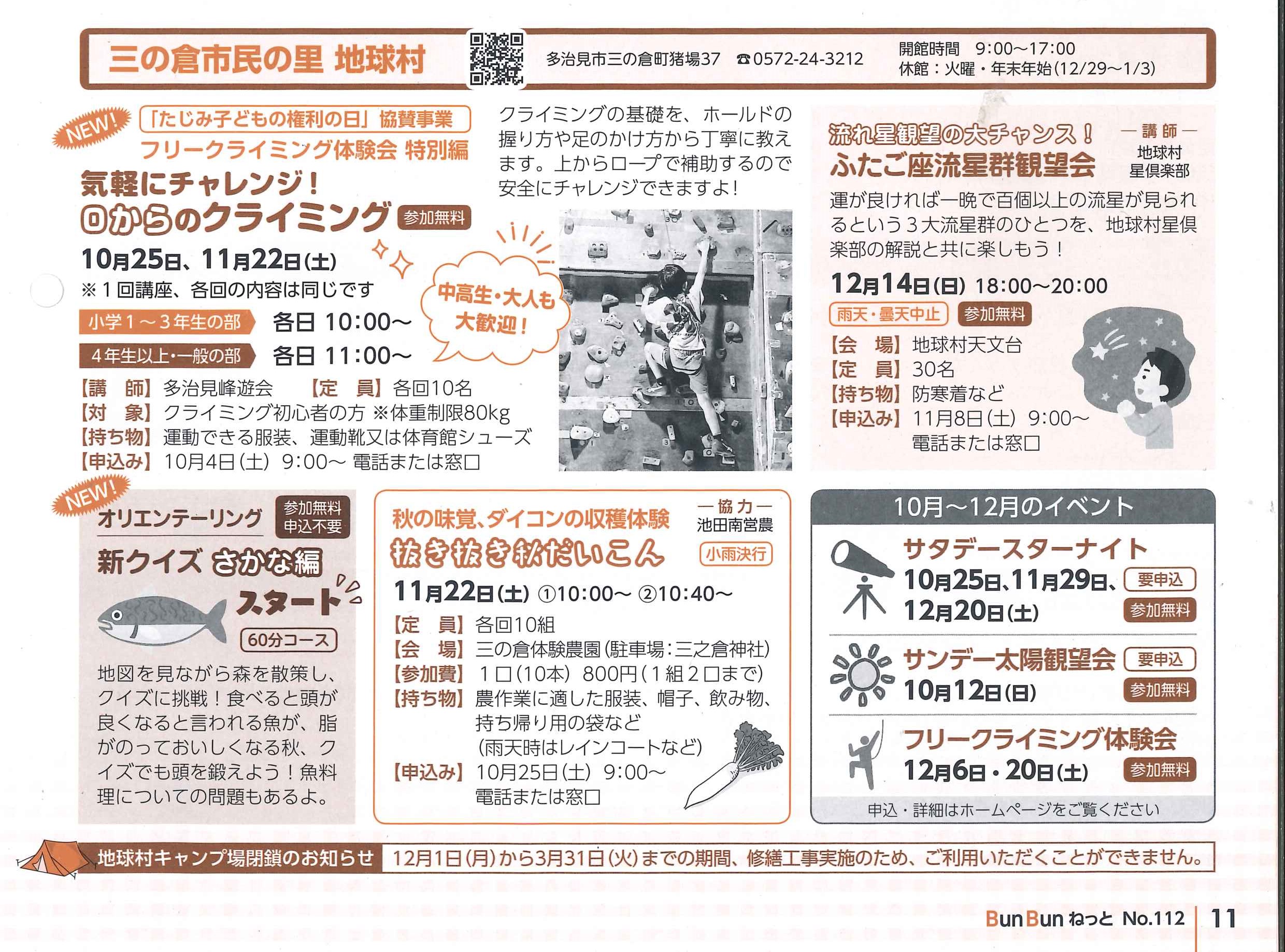 当ホームページ上では地球村で開催予定のイベント・講座情報のうち、一部のみを掲載しております。より詳しいイベント・講座情報をお求めの方は、多治見市内各戸に配布しております「広報たじみ(tajimist)」「BunBunねっと」をご覧ください。それぞれ下記のサイトからpdf版をダウンロードできます。
