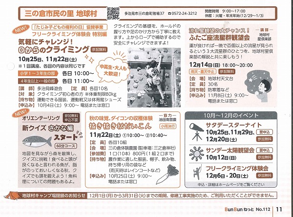 当ホームページ上では地球村で開催予定のイベント・講座情報のうち、一部のみを掲載しております。より詳しいイベント・講座情報をお求めの方は、多治見市内各戸に配布しております「広報たじみ(tajimist)」「BunBunねっと」をご覧ください。それぞれ下記のサイトからpdf版をダウンロードできます。