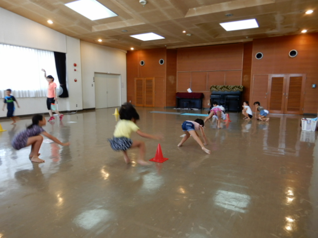暑すぎて外では遊べないような日が続いていますが、小学生のみんなは元気いっぱい!ストレッチや、音楽に合わせたダンスなども取り入れて、楽しい体操の体験ができたかと思います。ワニやカエルなど動物の動きを真似た体操など、普段は動かさないような筋肉も使って、いい汗をかいていました。