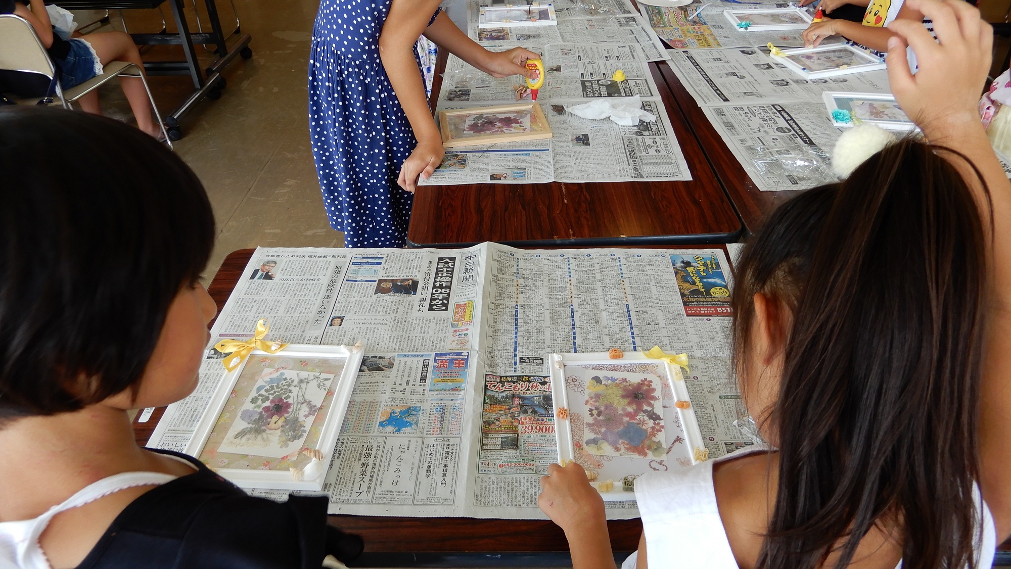 押し花作品ができたらフレームに入れて、フレームの周りもリボン、貝殻、マカロニなどで可愛く飾って出来上がりです。皆さん最後までこだわって自分だけの作品を作り上げました。一人ずつがんばった所を発表して講座を無事終えることができました。きっと夏休みの思い出の素敵な作品になったと思います。小畑先生、参加してくださった皆さん、ありがとうございました。