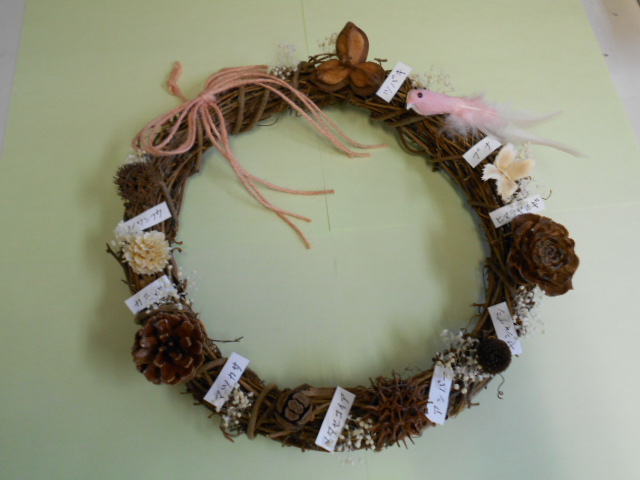 トロッケンクランツでは木の実の標本リースを作りました。お子さんには少し難しい作業でしたが、ワイヤーをラジオペンチでリースに付けたり、小さな飾りをボンドでくっつけたりしました。付けた木の実には標本の名前を書いてリボンも飾って完成しました。