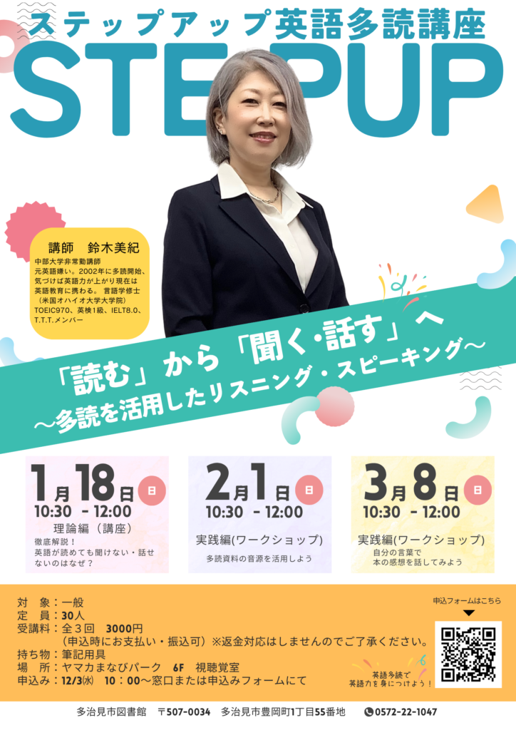多治見市図書館 本館 » 英語多読 » 英語多読のお知らせ » 『ステップアップ英語多読「読む」から「聞く・話す」へ〜多読を利用したリスニング・スピーキング~』のお知らせ