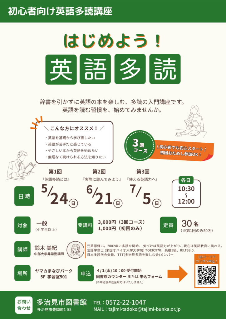 多治見市図書館 本館 » 英語多読 » 英語多読のお知らせ » 初心者向け英語多読講座『はじめよう!英語多読』のお知らせ