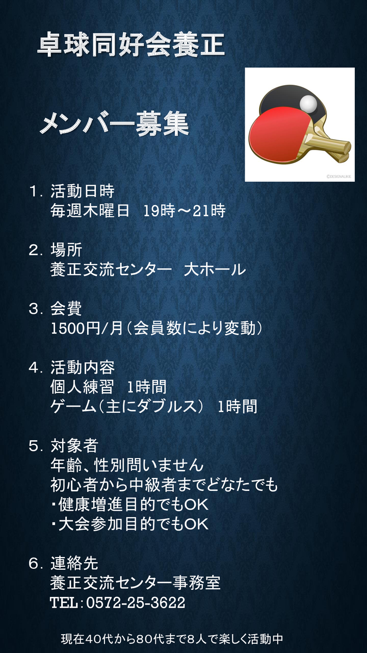 | 卓球同好会養正 | 木曜 | 19時 | ~ | 21時 | |||||||||||||||||||||||